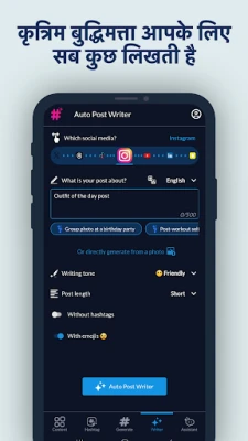 सोशल मीडिया पर अपनी पहचान बनाना अब और भी आसान है! हैशटैग्स एआई आपको ऐसे बेहतरीन उपकरण प्रदान करता है जो आपके हर पोस्ट को असाधारण बना देंगे। हमारा प्रमुख 'ऑटो राइटर' फीचर आपके लिए आकर्षक और सटीक कैप्शन तैयार करता है, जो इंस्टाग्राम से लेकर लिंक्डइन तक, सभी प्लेटफार्मों पर आपकी सामग्री को चमका सकता है। इसके साथ ही, हमारा तीव्र हैशटैग जनरेटर पलक झपकते ही आपके मुख्य विषय से संबंधित सबसे प्रासंगिक और प्रभावी हैशटैग्स ढूँढ निकालता है, जिससे आपकी पोस्ट की पहुँच कई गुना बढ़ जाती है।