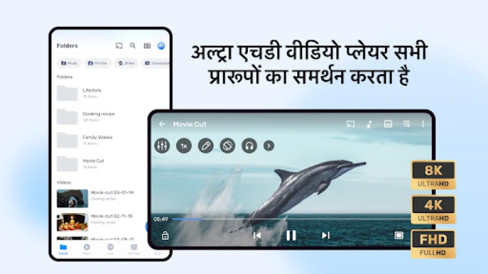 Amazon MX Player आपके मनोरंजन के अनुभव को एक नई ऊँचाई पर ले जाता है। हमारी अत्याधुनिक हाइब्रिड हार्डवेयर एक्सेलेरेशन (HW/HW+) तकनीक के साथ, आप 8K, 4K अल्ट्रा HD और HD वीडियो प्लेबैक का सहज और बेजोड़ आनंद ले सकते हैं। यह सिर्फ एक वीडियो प्लेयर नहीं, बल्कि एक संपूर्ण मनोरंजन हब है जहाँ उच्च गुणवत्ता वाले विजुअल्स आपकी उंगलियों पर उपलब्ध हैं, हर फ्रेम को क्रिस्टल-स्पष्टता के साथ प्रदर्शित किया जाता है।