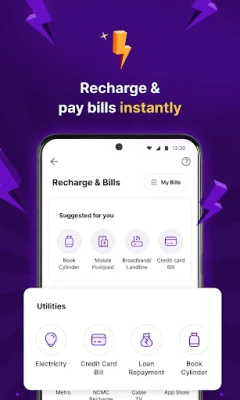 PhonePe आपकी जरूरतों के लिए पूर्व-अनुमोदित पर्सनल लोन की सुविधा भी प्रदान करता है, जिसे एक सुगम डिजिटल प्रक्रिया के माध्यम से सीधे आपके बैंक खाते में भेजा जा सकता है। इसमें 6 से 36 महीने की पुनर्भुगतान अवधि और अधिकतम 30.39% की वार्षिक प्रतिशत दर (APR) के साथ, आदित्य बिड़ला, पिरामल, IDFC फर्स्ट जैसे प्रमुख भारतीय ऋणदाताओं के साथ भागीदारी की गई है। इसके अतिरिक्त, अपने मोबाइल, DTH को रिचार्ज करें और क्रेडिट कार्ड, बिजली, पानी, गैस या ब्रॉडबैंड सहित सभी यूटिलिटी बिलों का भुगतान आसानी से करें। अपनी खरीदारी के रिफंड को ट्रैक करें और PhonePe गिफ्ट कार्ड के साथ एक लाख से अधिक ऑनलाइन और ऑफलाइन आउटलेट्स पर भुगतान की सुविधा का आनंद लें। PhonePe आपकी सभी वित्तीय आवश्यकताओं के लिए एक सुरक्षित और भरोसेमंद मंच है।