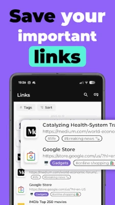 अपने सभी बुकमार्क्स को एक ही जगह पर सुरक्षित रखें और व्यवस्थित करें। यह ऐप आपको महत्वपूर्ण लिंक्स कभी न खोने में मदद करता है, उन्हें आसानी से एक्सेस करने और प्रबंधित करने का सरल तरीका प्रदान करता है।